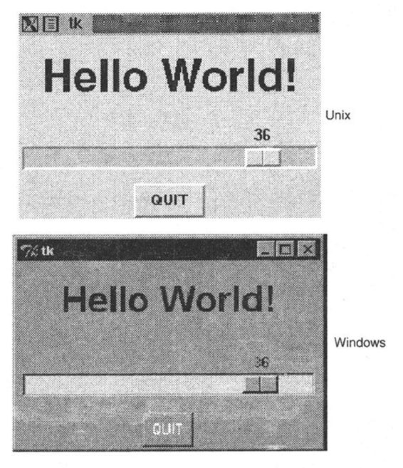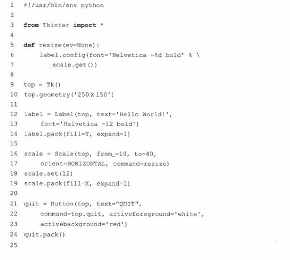 我们的最后一个例子tkhello4.py,增加了一个进度条组件。具体来说,这个进度条是用来和标签组件交互的。进度条的滑块被用作控制标签组件文本大小的工具。滑块的位置值越大字体就越大,反之亦然,越小的位置值意味着越小的字体。例19.4展示了tkhello4.py的源码。