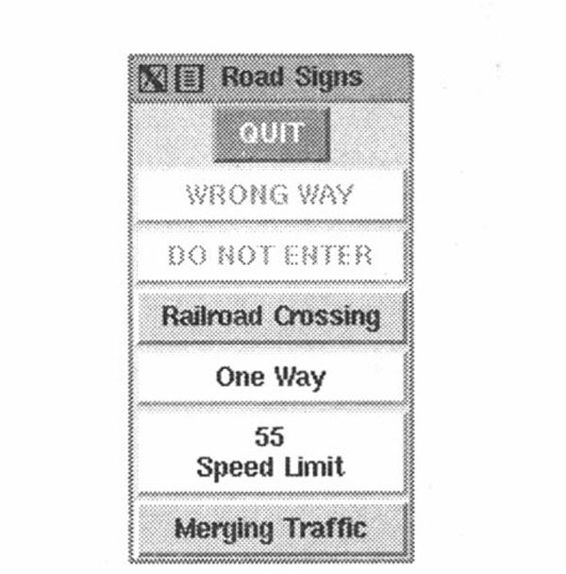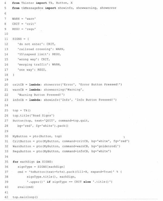 我们将用交通指示牌作为例子,程序中尝试创造一种文字型的交通指示牌,并且把它们分成如下几类:危急、警告、通知(正好和日志信息级别相类似)。指示牌的类型决定了它们在创建时的颜色格局。例如,危急指示牌使用亮红文字和白色背景,警告指示牌使用黑色文字和金色背景,通知也就是普通指示牌使用黑色文字和白色背景。我们约定“Do Not Enter”和“Wrong Way”标识为危急,“MergingTraffic”和“Railroad Crossinig”标识为警告,“Speed Limit”和“One Way”标识为通知。该程序创造“指示牌”,它们都只是些按钮。当用户点下按钮时,将简单地弹出一个Tk响应对话框,显示危急/错误、警告、通知。这的确不够好玩,但如何创建这些按钮却很有趣。你将在例19. 5看到这里所描述的程序。