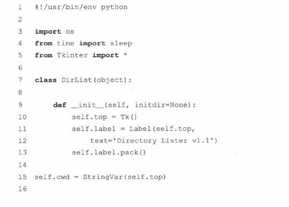 这些行定义了DirList类的构造器,以及一个代表我们程序的对象。我们创建的第一个标签包含了应用程序的主标题和它的版本号。