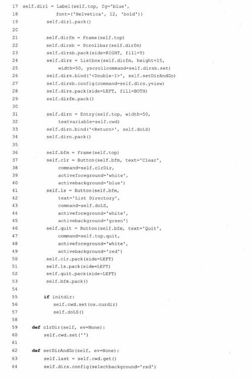 这段代码定义了我们这个GUI程序的核心,dirs(列表框)包含了被列目录的文件列表。使用一个滚动条以便用户在文件数目超过列表框窗口尺寸时移动列表。这两个组件都包含在一个框架组件中。列表框用bind()方法把回调函数(setDirAndGo)和列表项绑定起来。