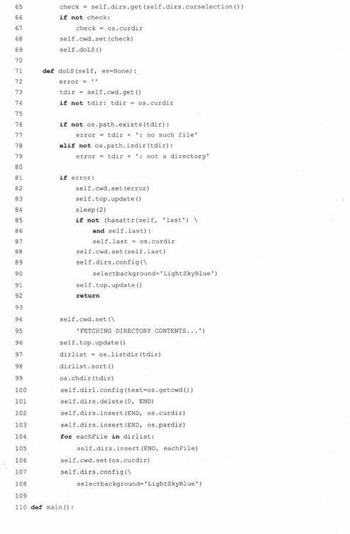 现在看来,doLS()是整个GUI程序的关键。它负责所有的安全性检查(目标是否是一个目录以及它是否存在?)如果有错误发生,最终目录会被设置为当前目录。如果一切正确,它调用os. listdir()来取得新的文件集合并替换列表框中的列表。当后台忙于获取新目录信息时,高亮的蓝色条会变成亮红色。当新目录设置完毕,它会恢复蓝色。
