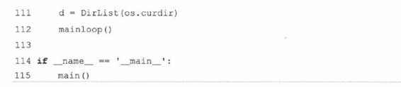 listdir.py中的最后一段代码明显是代码的主体。main()函数只有在该脚本被直接调用时才会执行,并且当它执行时会创建GUI程序,后者随之掌控该程序。
