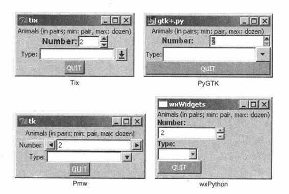 Tix模块包含在Python标准库中,已经可用了。其他工具集是第三方的,你必须自己下载。因为Pmw只是对Tkinter的一个扩展,它的安装是最简便的(只需解压到你的网络包目录下)。wxPython和PyGTK涉及下载多个文件并编译(除非你使用的是Win32版本,这样的话通常有安装包可用)。一旦这些工具集安装好并通过证,我们就能开始了。我们不打算局限在本章已经讲过的那些组件上,我们准备在后面的例子中介绍一些更复杂的组件。