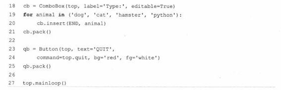 这些行创建了所有的组件:标签(9~11行)、控制(13〜16行)、组合框(18〜21行)和退出按钮(23〜25行)。组件构造器里的参数都很浅显明了无需更多解释。最后,我们在第27行进入GUI主事件循环。