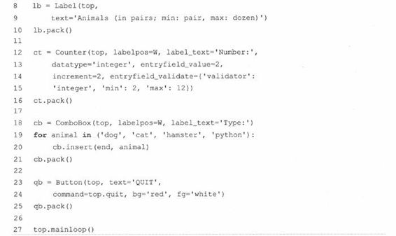 这个Pmw的例子和上面Tix的例子是如此相似,以致我们不准备对读者逐行解释它。代码中区别最大的一行是控制组件的构造器,那个Pmw的控制组件。它提供了验证函数的入口。不同于直接在组件构造器中以关键字参数的形式传入最大、最小值,Pmw使用“验证器”来确保值不会超出我们可接受的范围。