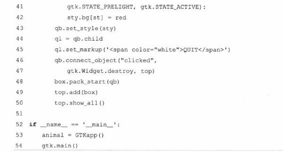 最后是PyGTK版的例子,它和wxPython GUI程序非常相似(见例19. 10) 。最大的不同是我们只用一个类,还有那些设置对象——实际上就是按钮——前景、背景色的代码实在是很冗长。