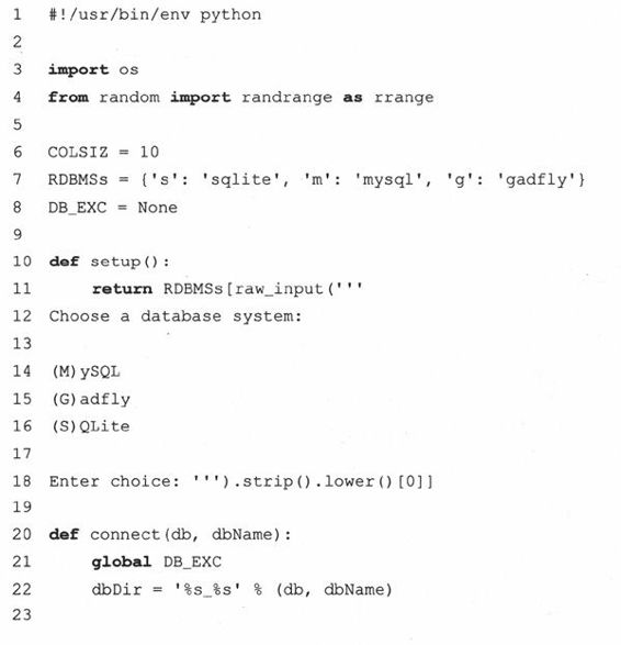脚本的第一部分导入必须的模块,创建一些”全局常量”(列的显示大小及我们的程序支持的数据库)。其中setup()函数提供一个简单界面让用户选择使用哪种数据库。