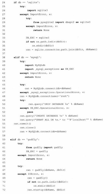 这里的connect()函数表现了数据库存取一致性。在每一小节的开头,我们尝试载入需要的数据库模块。如果找不到合适的模块,None值被返回,表示这个数据库系统暂不支持。