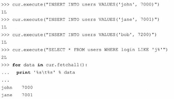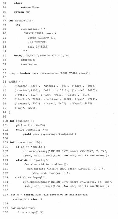 由于各种数据库之间有一些细微差别,insert()函数里的代码是依赖具体数据库的。举例来说,SQLite和MySQL的接口程序都是DB-API兼容的,所以它们的游标对象都拥有executemany()方法,可是Gadfly没有这个方法,因此它只能一次插入一行。