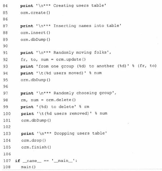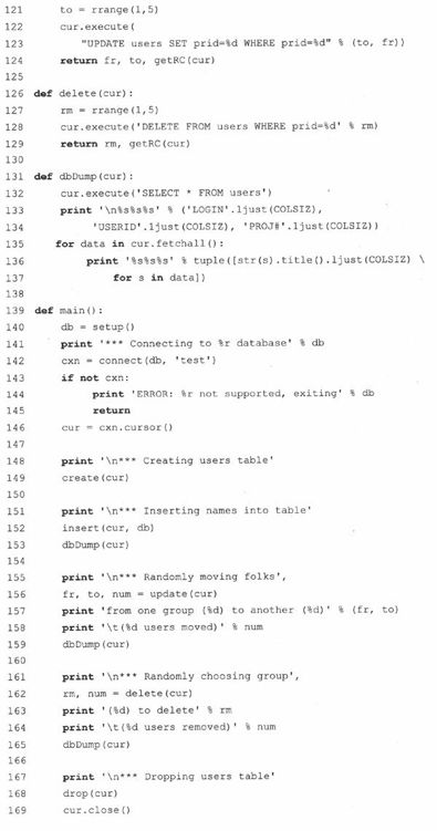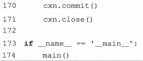 本部影片的导演main()出场。它将上面定义的这些函数组织起来,让它们尽情发挥。(假定它们没有因为找不到数据库接口程序或者不能得到有效连接对象而中途退出(第143~145行))。它的大部分代码都是能够自我解释的print语句。最后main()关闭游标对象,提交操作,然后关闭数据库连接。脚本的最后几行代码用来启动脚本的执行。
