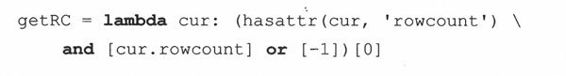 这独立的一行是有一个条件表达式(读作Python 3目操作符),它返回最后一步操作所影响的行数,如果游标对象不支持这个属性(也就是说这个接口程序不兼容DB-API)的话,它返回-1。python2.5中新增了条件表达式,如果你使用的是python 2.4.x或更老版本,你可能就需要将它转换为老风格的方式了,如下所示。