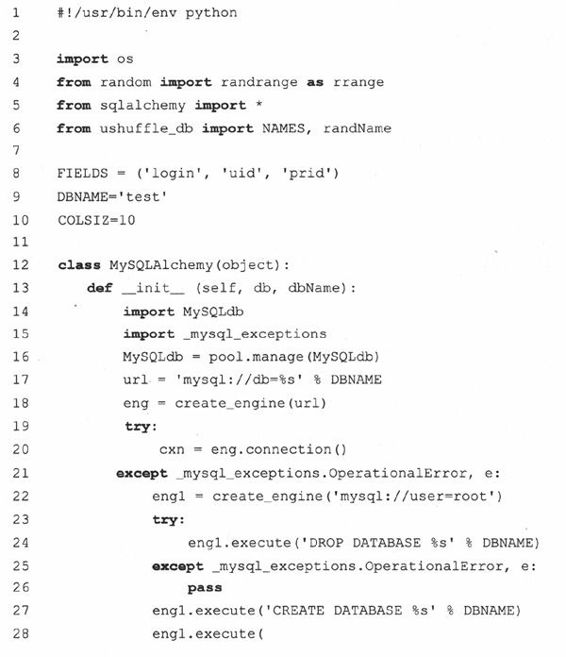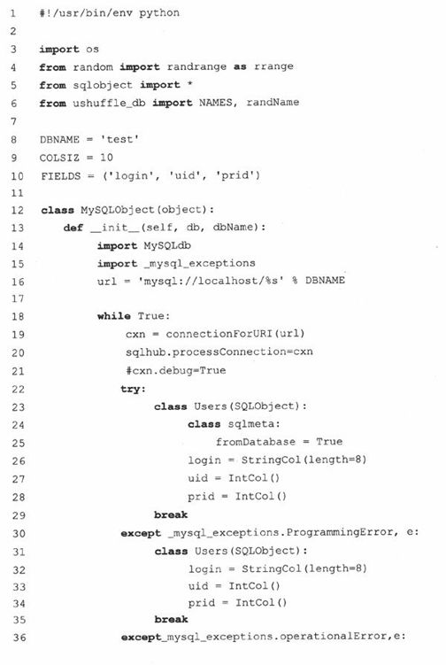 现在我们将shuffle应用程序ushuffle_db.py改造为使用SQLAlchemy和SQLObject实现。数据库后端仍然是MySQL。相对于直接使用原始SQL来讲,我们使用ORM时用类代替了函数,这样会更有对象的感觉。两个例子都使用了ushuffle_db.py中的NAMES集合和随机名字选择函数。这是为了避免将同样的代码到处复制粘贴,代码能够被有效重用是件好事情。