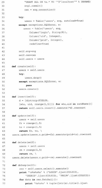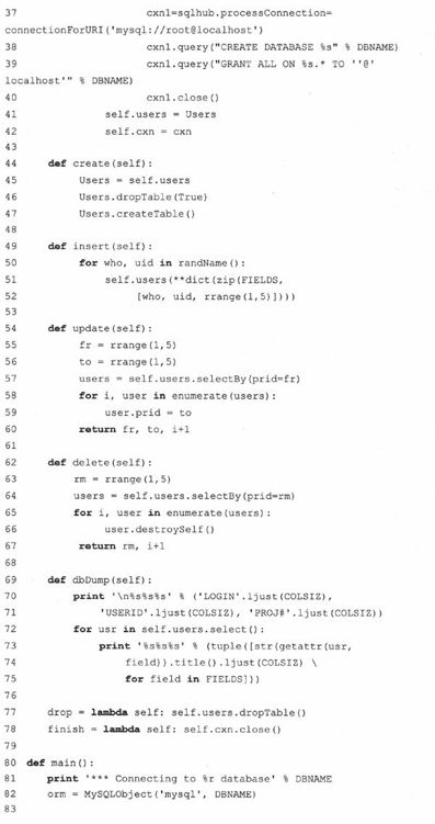 这些行处理数据库操作。我们在44〜47行创建了表,并在77行删掉了表。在49〜52行插入数据,在54〜60行更新数据,在62〜67行删除了数据。78行调用了finish()方法来关闭数据库连接。我们不能像SQLAlchemy那样使用授权删表代理,因为SQLObject的删表代理名为dropTable()而不是drop().