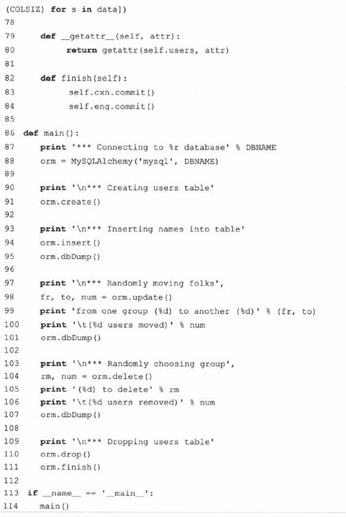 main()函数是整个应用程序的入口,它创建了一个MySQLAlchemy对象并通过它完成所有的数据库操作。这段脚本和ushuffle_db.py功能一样。你会注意到数据库参数db是可选的,而且在ushuffle_sa.py和即将碰到的ushuffle_so.py中,它不起任何作用。它只是一个占位符以方便你对这个应用程序添加其他的数据库支持(参见本章后面的习题)。