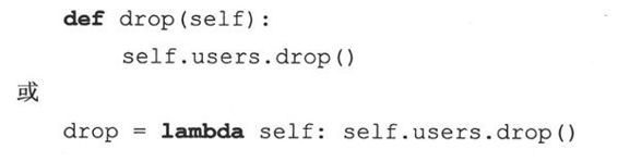 应该尽量避免为一个表创建一个drop()方法,因为这总是会调用table自身的drop()方法。同样,既然没有新增功能,那我们有什么必要创建另一个函数?无论属性查找是否成功,特殊方法getattr()总是会被调用。如果调用orm.drop()却发现这个对象并没有drop()方法,getattr(orm,’drop’)就会被调用。发生这种情况时,__getattr__()被调用,之后将这个属性名委托给self.users。解释器会发现self.users有一个drop属性并执行。