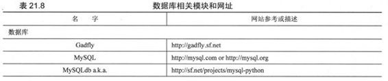 表21.8列出了常见的Python数据库接口程序,注意不是所有的接口程序都是DB-API兼容的。