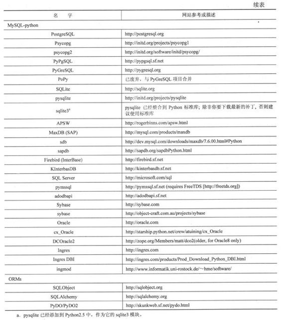 其他的Python ORM包括pyDO/PyD02、PDO、Dejavu、Durus、QLime和ForgetSQL。一些大型的Web开发工具/框架也可以有自己的ORM组件,如WebWare MiddleKit和Django的数据库API。需要指出的是,知名的ORM并不意味着就是最适合你的应用程序的ORM。那些其他的ORM虽然没有纳入我们的讨论范围,但一样有可能是适合你的应用程序的选择。