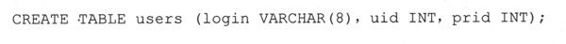 这个语句用于创建表users,它有一个类型为字符串的列login和两个类型为整型的字段uid和prid。