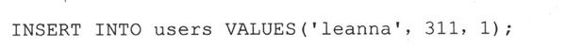INSERT语句用来向数据库中添加新的数据行。语句中必须指定要插入的表及该表中各个字段的值。上例中,表名是users,字符串’leanna’对应着login字段,311和1分别对应着uid和prid。