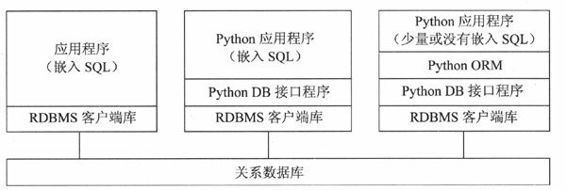 图21-1演绎了Python数据库应用程序的结构(包括使用和不使用ORM)。你可以看到DB-API是数据库客户端C库的接口。