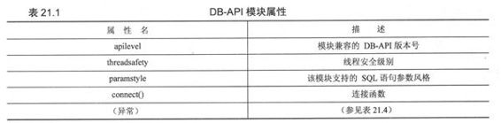 DB-API规范里的以下特性和属性必须提供。一个DB-API兼容的模块必须定义如下,表21.1中定义的所有全局属性。