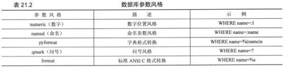 DB-API支持多种方式的SQL参数风格。这个参数是一个字符串,表明SQL语句中字符串替代的方式。(参阅表21.2)