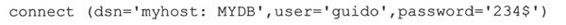数据库连接参数可以以一个DSN字符串的形式提供,也可以以多个位置相关参数的形式提供(如果你明确知道参数的顺序的话),也可以以关键字参数的形式提供。下面是一个来自PEP 249的使用connect()的例子: