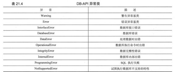 兼容标准的模块也应该提供这些异常类。见表21.4。表21.4 DB-API异常类