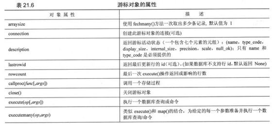 创建游标对象之后,你就可以执行查询或其他命令(或者多个查询和多个命令),也可以从结果集中取出一条或多条记录。表21.6列举了游标对象拥有的属性和方法。
