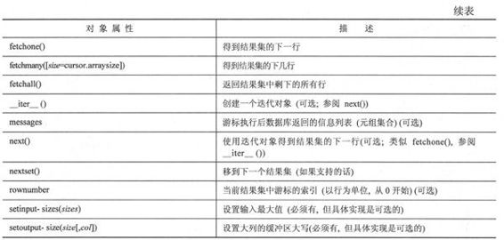 对不支持游标的数据库来说,cursor()方法仍然会返回一个尽量模仿游标对象的对象。这是最低要求。特定数据库接口程序的开发者可以任意为他们的接口程序添加额外的属性,只要他们愿意。