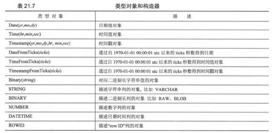 举例来说,一个Python字符串可能被转换为一个VARCHAR或一个TEXT,或一个BLOB,或一个原生BINARY对象,或一个DATE或TIME对象。一个字符串到底会被转换成什么类型?必须小心地尽可能以数据库期望的数据类型来提供输入,因此另一个DB-API的需求是创建一个构造器以生成特殊的对象,以便能够方便地将Python对象转换为合适的数据库对象。表21.7描述了可以用于此目的的类。SQL的NULL值被映射为Pyhton的NULL对象,也就是None。