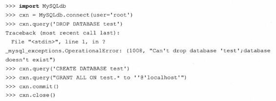 MySQL(38~57行)的数据文件会存保在默认的数据存储区域,所以不需要用户指定存储位置。我们的代码尝试连接指定的数据库。如果发生错误,有可能是数据库不存在,或者虽然数据库存在但我们没有权限访问它。由于这仅仅是一个测试应用程序,我们选择完全先删掉这个数据库(忽略掉如果数据库不存在可能引发的错误),然后重建该库,然后给访问它的用户赋予权限。