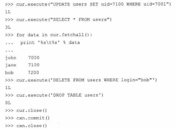 在数据库连接建立以后,其余的代码对数据库和接口程序来说都是透明的(不区分哪种数据库、哪种接口程序,代码都可以工作)。有一个唯一的例外,就是脚本的insert()函数。在这部分代码的所有3小段中,数据库连接成功后会返回一个连接对象cxn。