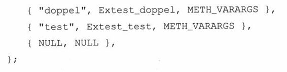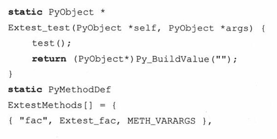 这个数组由多个数组组成。其中的每一个数组都包含了一个函数的信息。最后放一个NULL数组表示列表的结束。我们为Extest模块创建一个ExtestMethods[]数组: