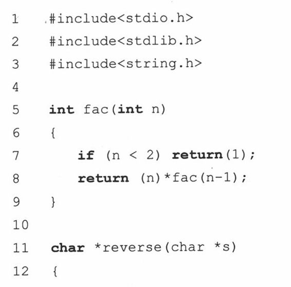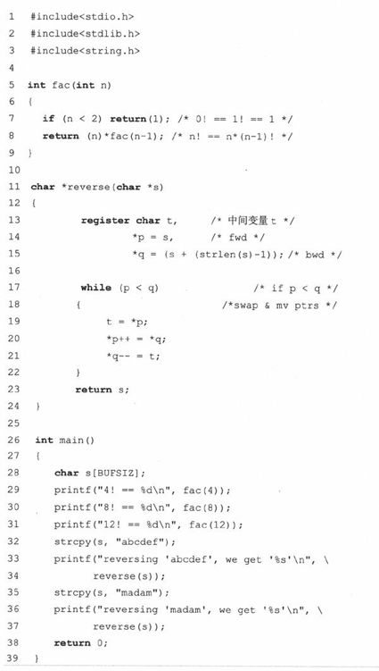 代码中,包含了两个函数fac()和reverse()。分别实现了我们刚刚所说的两个功能。fac()接受一个整型参数并递归计算结果,在退出最后一层调用后最终返回到调用代码中。