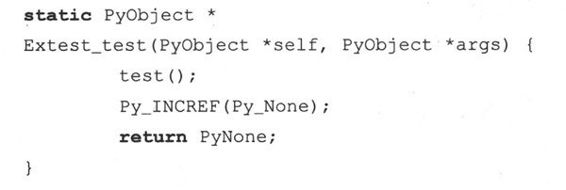 在上面的Extest_test()函数中,我们创建了一个空字符串的PyObject对象,用以返回None。或者,你也可以对空对象(PyNone)的引用计数加1,成为PyNone的拥有者,然后直接返回PyNone,见下例。