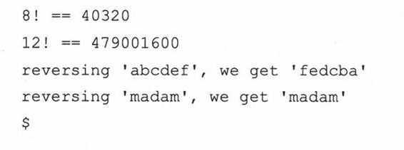 最后一段代码是必要的main()函数。我们在这里面写测试代码,传不同的参数给fac()和reverse()。有了这个函数,我们就可以了解我们的代码是否能得到正确的结果。