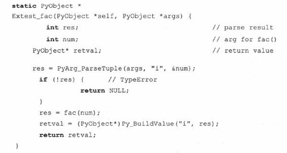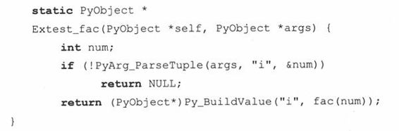 对于fac()函数来说,当客户程序调用Extestfac()的时候,我们的包装函数就会被调用。它接受一个Python的整型参数,把它转为C的整型,然后调用C的fac()函数,得到一个整型的返回值,最后把这个返回值转为Python的整型数作为整个函数调用的结果返回(在你头脑中,要保持一个想法:我们所写的其实就是“deffac(n)”这段声明的一个代理函数,当代理函数返回的时候,就像是这个想像中Python的fac()函数在返回一样).