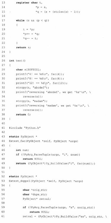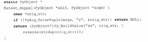 跟Extest_fac()类似,我们接收一个字符串型的参数,保存到orig_str中。注意,这次,我们要使用“s”格式字符串。然后调用strdup()函数把这个字符串复制一份(由于我们要同时返回原始字符串和反转后的字符串,所以我们需要复制一份)。把新复制的字符串传给reverse函数,我们就得到了反转后的字符串。
