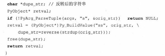 如你所见,我们用“ss”格式字符串让Py_BuildVahie()函数生成了一个含有两个字符串的元组,分别放了原始字符串和反转后的字符串。这样就完成所有的工作了吗?很不幸,还没有。