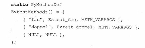 每一个数组都包含了函数在Python中的名字,相应的包装函数的名字以及一个METH_VARARGS常量。其中,METH_VARARGS常量表示参数以元组形式传入。如果我们要使用PyArg_ParseTupleAndKeywords()函数来分析命名参数的话,我们还需要让这个标志常量与METH KEYWORDS常量进行逻辑与运算常量。最后,用两个NULL来结束我们的函数信息列表。