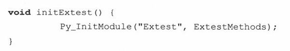 所有工作的最后一部分就是模块的初始化函数。这部分代码在模块导入的时候被解释器调用。在这段代码中,我们需要调用Py_InitModule()函数,并把模块名和ModuleMethods[]数组的名字传递进去,以便解释器能正确地调用我们模块中的函数。对Extest模块来说,initExtest()函数应该是这个样子的: