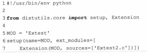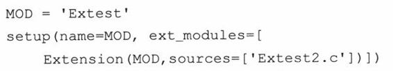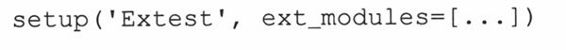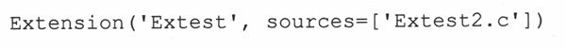 第一个参数是(完整的)扩展的名字,如果模块是包的一部分的话,还要加上用“.”分隔的完整的包的名字。我们这里的扩展是独立的,所以名字只要写“Extest“就好了。sources参数是所有源代码的文件列表。同样,我们也只有一个文件Extest2.c。