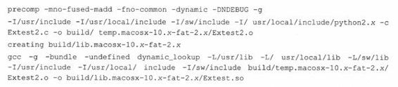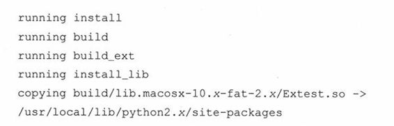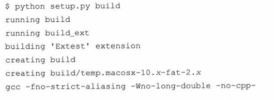 现在,我们已经有了setup.py文件。运行setup.py build命令就可以开始编译我们的扩展了。在我们的Mac机上的输出如下(使用不同版本的Python或是不一样的操作系统时,输出会有一些不同):