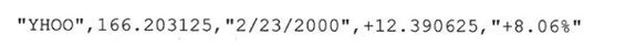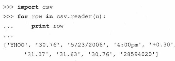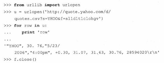 如果我们使用urllib.urlopen()来得到报价,会得到一行CSV格式的返回结果: