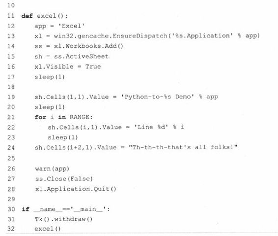 在Windows 32位平台上,Python与COM是可以相互操作的。COM是微软的一种接口技术,它定义了语言及格式无关的对象与对象之间或是更高层次的应用程序与应用程序之间的通讯。本节中,我们将看到如何把Python与COM(客户端编程)组合起来,与微软Office的应用程序如Word、Excel、PowerPoint和Outlook之间进行通讯。