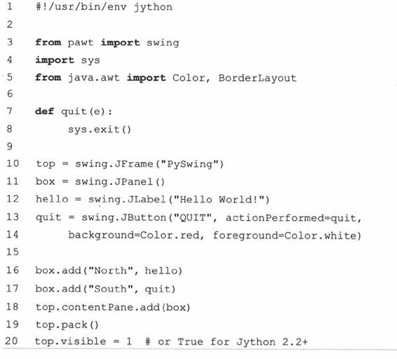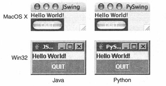 两段代码都与tkhello3.py—一致,惟一的区别就是它们使用了Swing而不是Tk。Python版本的特点是,做同样的事,Python所要写的代码相对于Java大幅减少。Python代码的表达能力更强,所以每一行都显得更为重要。简单地说,就是“白色噪音”(译者注:指Java大量换行造成的留白部分)更少了。Java的代码更趋向于用更多的“样板”代码来完成工作,而Python则让你把注意力集中在你的应用的重要部位,即你要解决的问题的解决方案上。