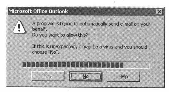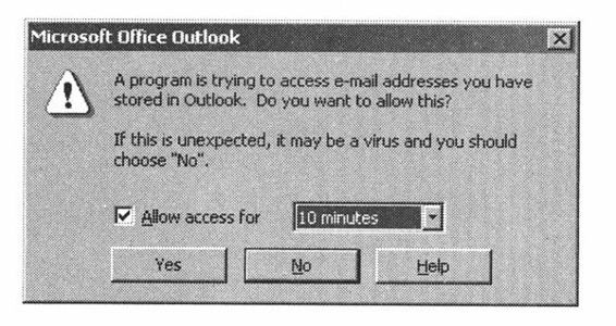 由于以前的Outlook总是被用于各种各样的攻击中,微软在Outlook中加入了一些保护措施,来限制对通讯簿的访问以及代表你发送邮件。当外部程序想要访问你的Outlook的数据的时候,会弹出一个如图23-5所示的对话框,以征取你的同意。