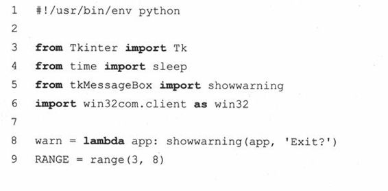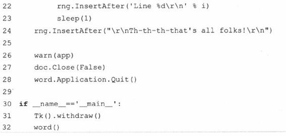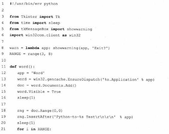 说的够多了,下面开始看一些代码吧。以下是一系列脚本,用于控制不同的微软的应用程序。这些脚本都导入了win32com.client模块和一些Tk模块来控制各个应用程序的启动(和其他操作)。同第19章一样,我们釆用。pyw后缀来避免不必要的DOS命令窗口。