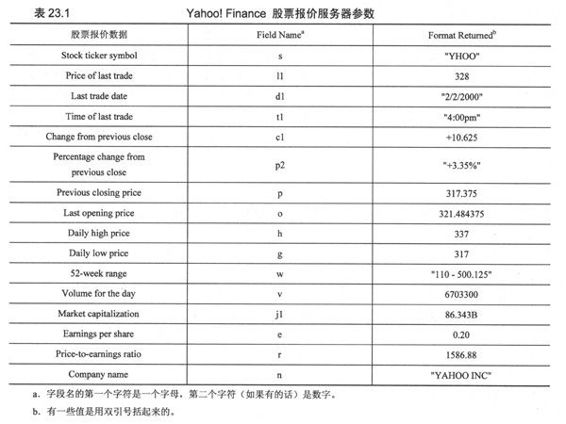 深入的分析这个API,我们可以得到更多的信息,如:上一次收盘价,52周内的最高和最低价等。总而言之,表23.1列出了返回数据的格式。